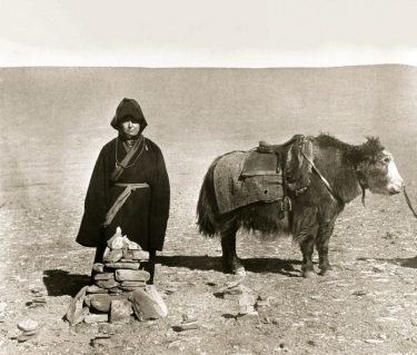 There is a story well known in the Tibetan religious world that illustrates a successful result of this practice. A young man begs the spiritual guidance of a mystic anchorite. The latter wishes him to begin by exercising himself in the concentration of mind. “What kind of work do you usually do?” he inquires of his new disciple. “I keep the yaks on the hills,” answered the man. (p. 167) All right,” says the gomchen. “Meditate on a yak.” The novice repairs to a cave roughly fitted up to serve as a habitation—a few such shelters can always be found in the regions inhabited by herdsmen—and settles down there. After some time, the master goes to the place and calls to his pupil to come out of the cave. The latter hears the gomchen’s voice, gets up and trys to walk out through the entrance of his primitive dwelling, but his meditation has achieved its purpose. The young man answers his guru: “I cannot get out, my horns prevent me.”