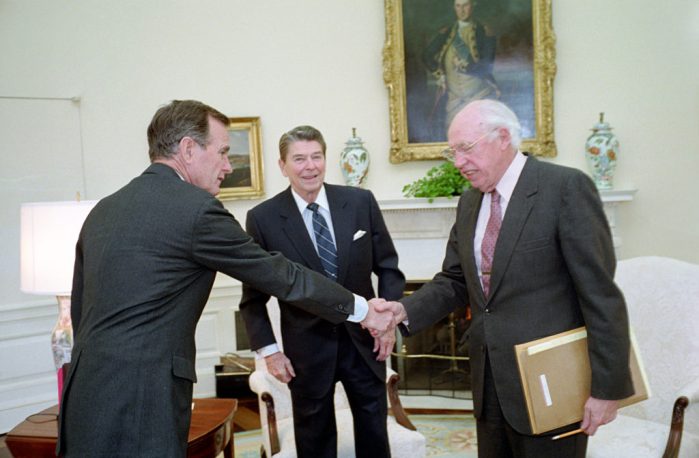 George Bush and CIA director William Casey shake hands as Reagan looks on (1986)