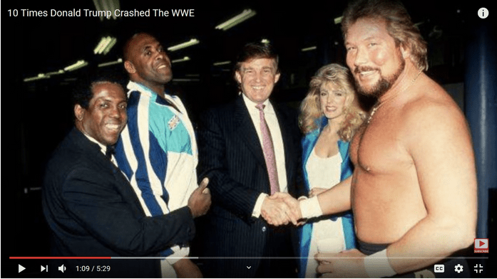 Here we have McMahon’s lifelong chum and mentee, even, The Donald, playing to both the fan audience that sees him as the hero and the other half of the country who sees him as the “heel.”