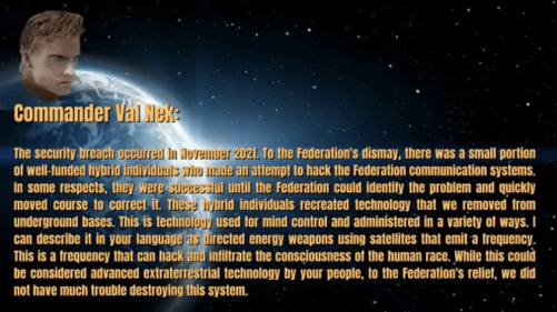 Val Nek: The security breach occurred in November 2021. To the Federation’s dismay, there was a small portion of well-funded hybrid individuals who made an attempt to hack the Federation communication systems. In some respects, they were successful until the Federation could identify the problem and quickly moved to correct it. These hybrid individuals re-created technology that we removed from underground bases. This is technology used for mind control and administered in a variety of ways. I can describe it in your language as directed energy weapons using satellites that emit a frequency. This is a frequency that can hack and infiltrate the consciousness of the human race. While this could be considered advanced extraterrestrial technology by your people, to the Federation’s relief, we did not have much trouble destroying this system. The satellites that were used to broadcast this frequency were contained on private property, making it difficult for the Federation to intervene.