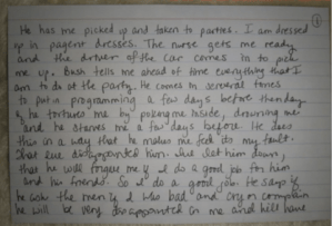 (1) He [Bush] has me picked up and taken to parties. I am dressed up in pageant dresses. The nurse gets me ready and the driver of the car comes in to pick me up. Bush tells me ahead of time everything I am to do at the party. He comes in several times to put in programming a few days before, then [the] day of [the party] he tortures me by poking me inside, drowning me, and he starves me a few days before. He does this in a way that he makes me feel it’s my fault, that I’ve disappointed him, I’ve let him down, that he will forgive me if I do a good job for him and his friends. So I do a good job. He says if he asks the men if I was bad and I cry or complain, he will be very disappointed in me and he’ll have . . .