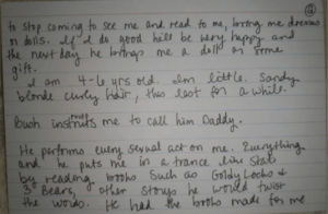 He performs every sexual act on me. Everything. And he puts me in a trance-like state by reading books such as Goldilocks and the Three Bears, other stories—he would twist the words. He had the books made for me.