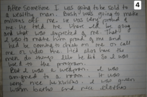 (4) After some time, I was going to be sold to a wealthy man. Bush was going to make millions off me. He was very proud of me. He told me where we’d be going and what was expected of me. That I was to make him proud of me and he’d be coming to check on me or call me or video me. He’d also have the men do things like he did, so I was used to the program. But I was a weapon. I was assigned to a room. It was very nice, luxurious. I was given warm baths and nice clothes . . .