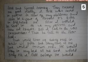 During the day Bush comes in to do psionic exercises on me. Testing me. He would bring in specialists to train me to do psionics, torture. He had me trained and my abilities were beyond anything he had ever seen. He began sending me to parties and showing me of — showing off my abilities and what I could do. I could move things, set to fire, read minds. But these were alters created and Bush had to be with me to give me the direction to switch.