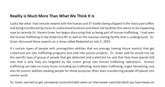 It looks like what I had remote-viewed with the human and ET bodies being shipped in stasis-pod coffins and being transferred by trains and antigravity crafts to undisclosed locations and black-site facilities—this seems to be happening now, as Dr. Steven Greer has recently begun discussing that in the context of human trafficking. In my remote-viewing of Antarctica I had seen the trafficking of humans as well as the massive underground cloning facility on that continent. Dr. Greer discussed these aspects on a show called “Redacted” on July 2, 2023. (https://www.bitchute.com/video/Kb6jxcXZ0Imi/)