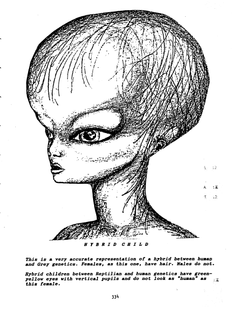 Drawing of a grey-human hybrd. Females have hair; males do not. Reptilian-human hybrids have green-yellow eyes with vertical pupils, and look less human.